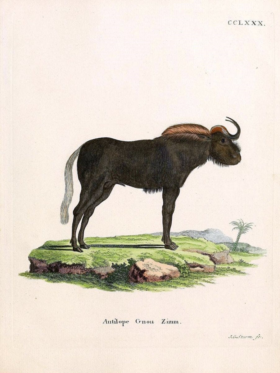 Die Säugthiere in Abbildungen nach der Natur /.Erlangen :Expedition des Schreber'schen säugthier- und des Esper'schen Schmetterlingswerkes [etc.,1774]-1846. |Mammals "Pictorial works" "Harvard University, MCZ, Ernst Mayr Library" |artist:name=Jakob Sturm | artist:viaf=54297493 taxonomy:genus=Connochaetes Wildebeest