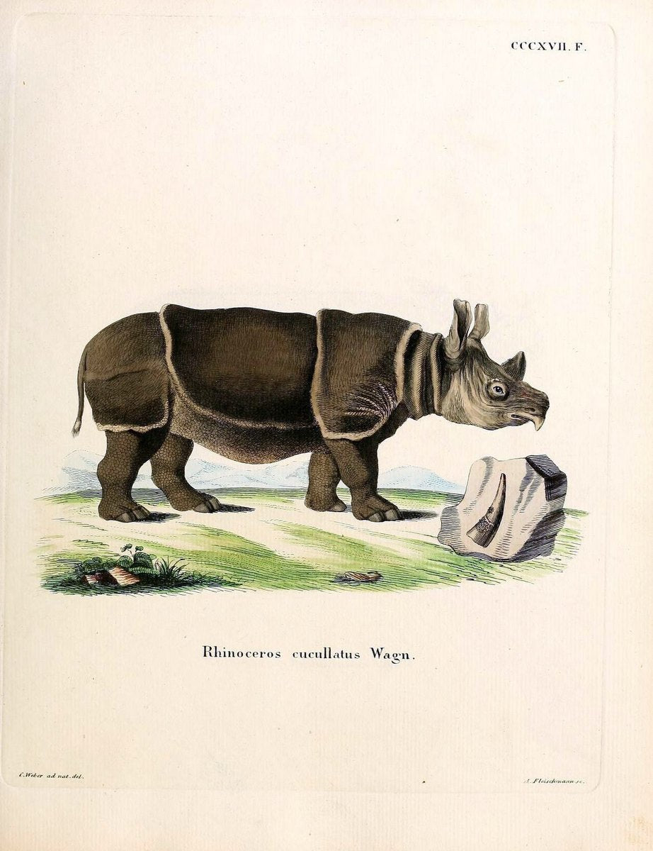 Die Säugthiere in Abbildungen nach der Natur /.Erlangen :Expedition des Schreber'schen säugthier- und des Esper'schen Schmetterlingswerkes [etc.,1774]-1846. |Mammals "Pictorial works" "Harvard University, MCZ, Ernst Mayr Library" |taxonomy:binomial=Rhinoceros cucullatus | rhino