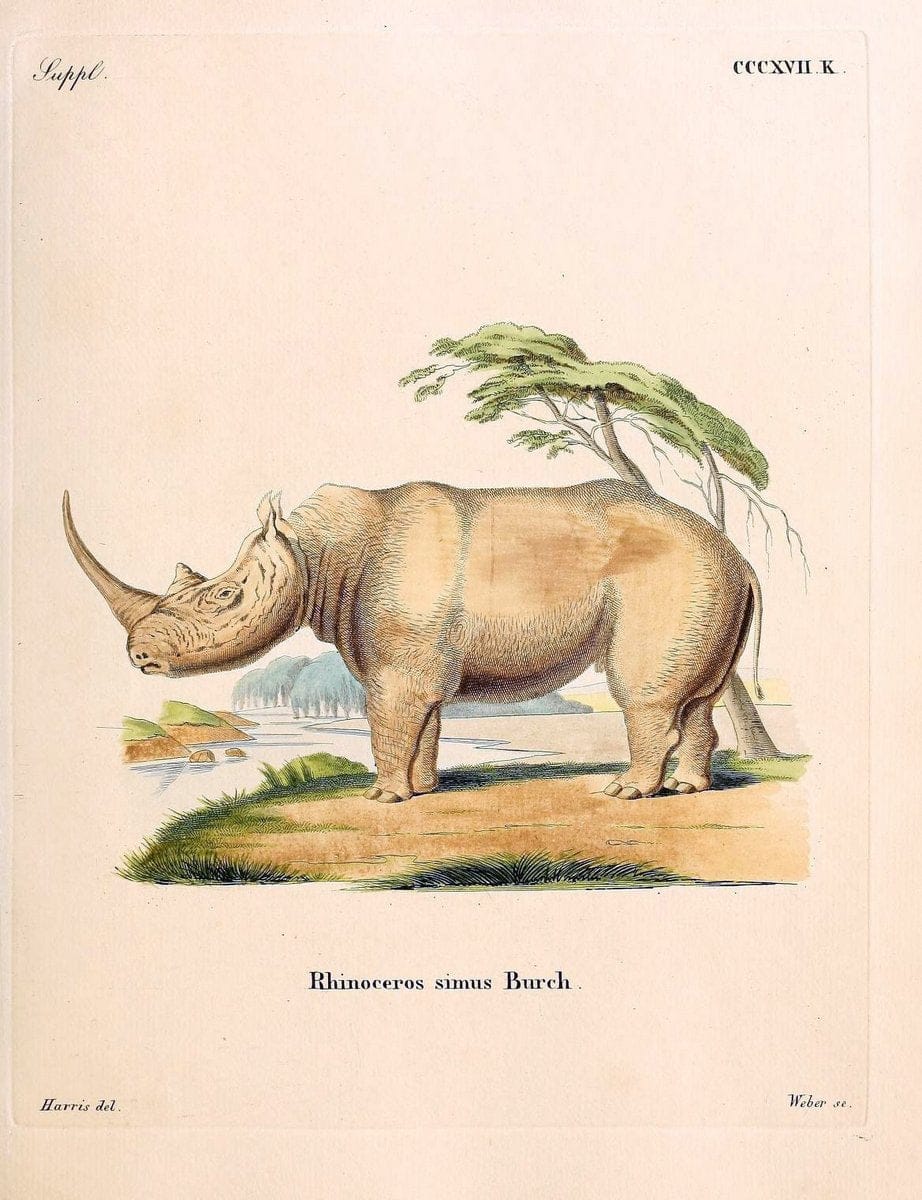 Die Säugthiere in Abbildungen nach der Natur /.Erlangen :Expedition des Schreber'schen säugthier- und des Esper'schen Schmetterlingswerkes [etc.,1774]-1846. |Mammals "Pictorial works" "Harvard University, MCZ, Ernst Mayr Library" |taxonomy:binomial=Rhinoceros simus | rhino