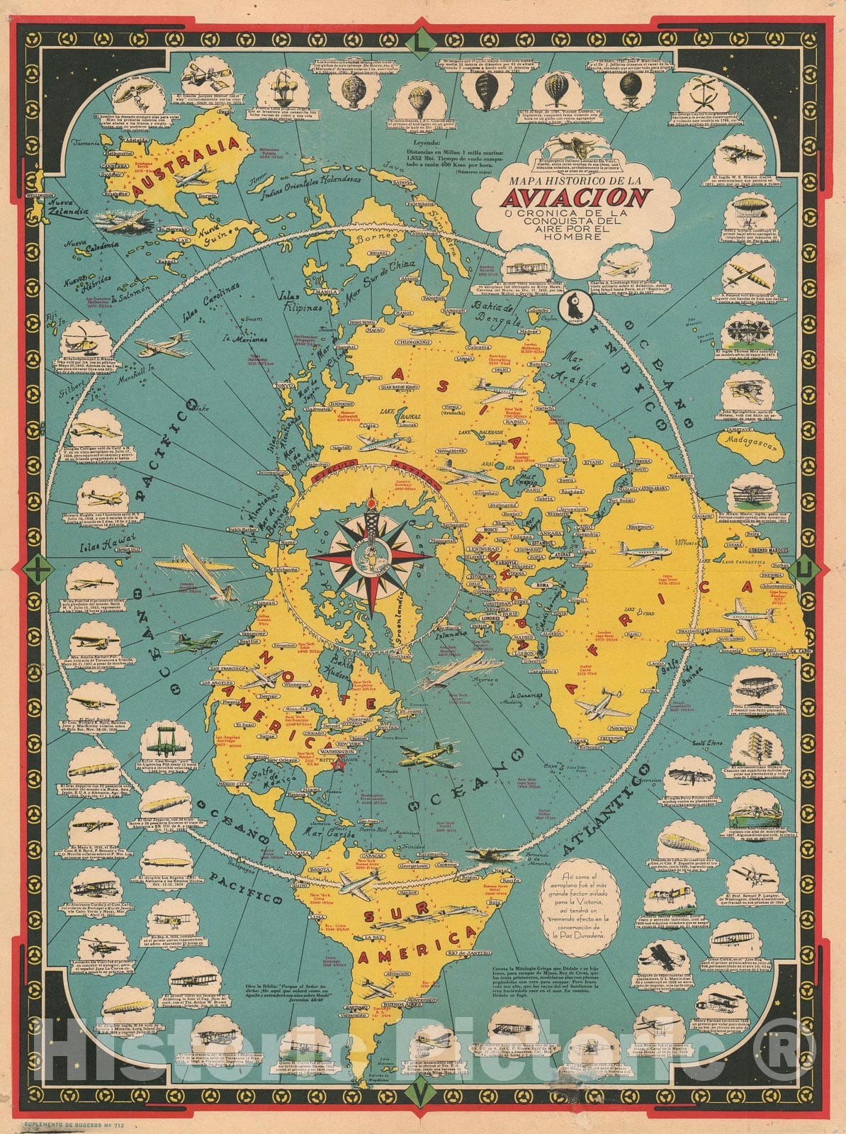 Historic Map : Chase Pictorial Map of The History of Aviation Published in Spanish, 1945, Vintage Wall Art