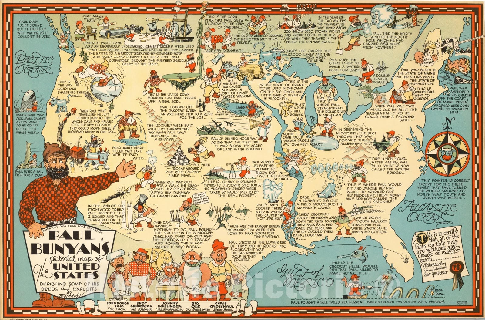 Historic Map : Paul Bunyan's pictorial map of the United States Depicting Some of his Deeds and Exploits By R. D. Handy, 1935, R. D. Handy, Vintage Wall Art