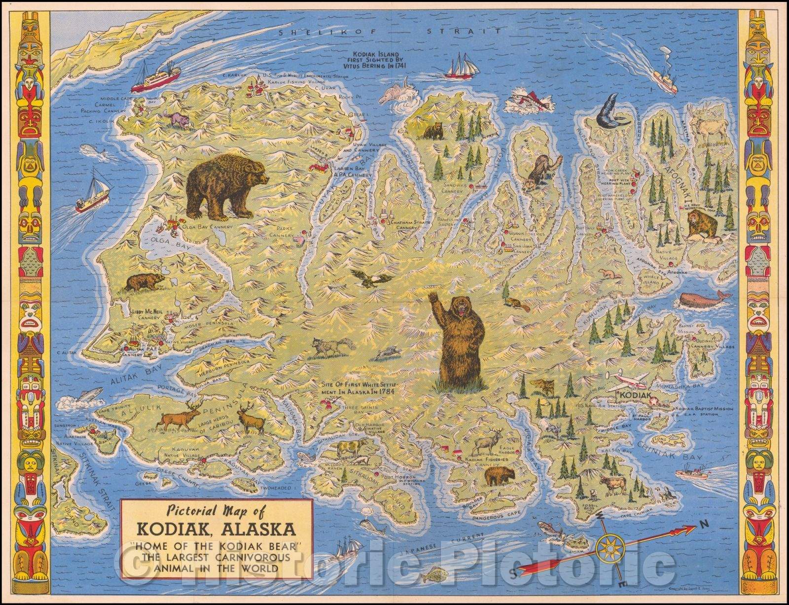 Historic Map - Pictorial Map of Kodiak Alaska, 1948, Lowell E. Jones - Vintage Wall Art