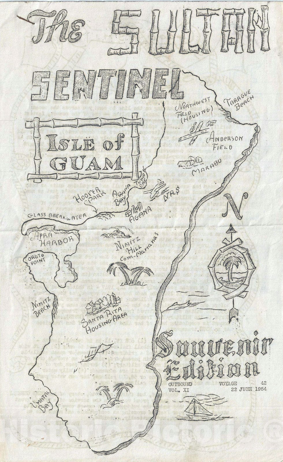 Historic Map : U.S. Navy Shipboard Zine 'Sultan Sentinel' w/ Guam Pictorial Map, 1954, Vintage Wall Art