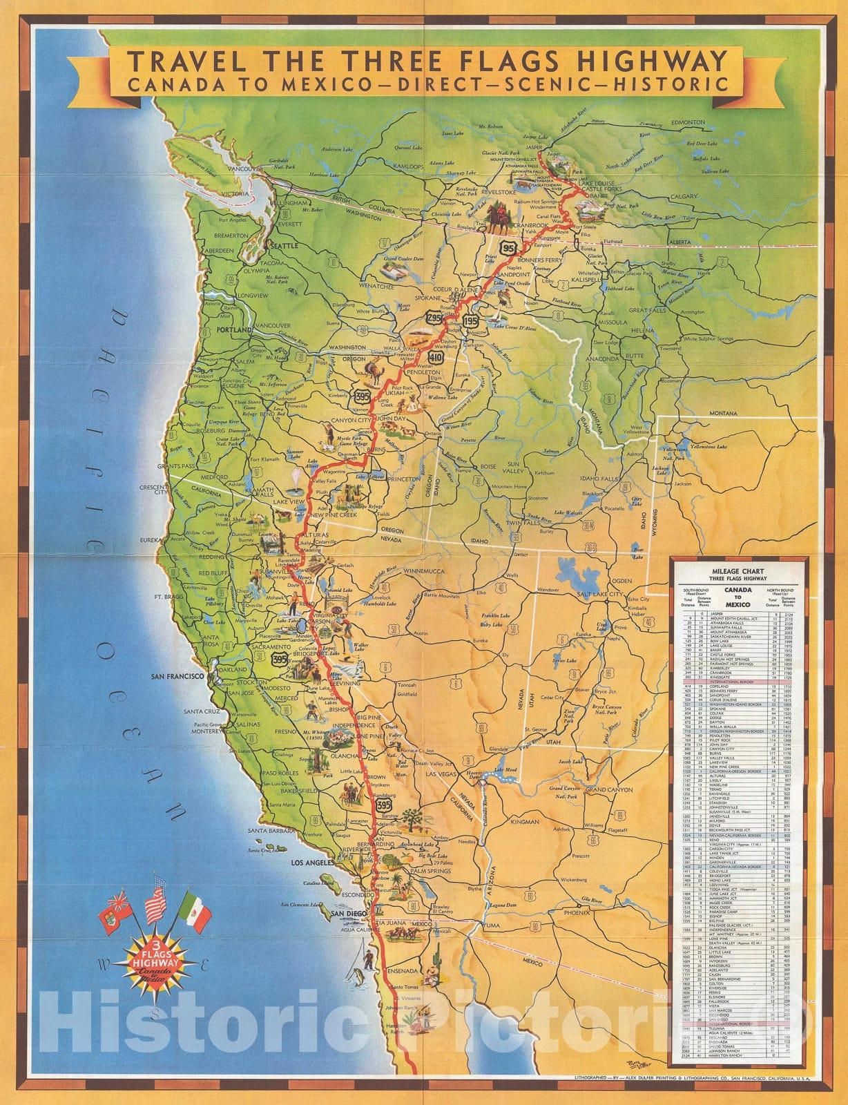 Historic Map : Vittier Pictorial Map of U.S. Highway 395, The Three Flags Highway, 1950, Vintage Wall Art