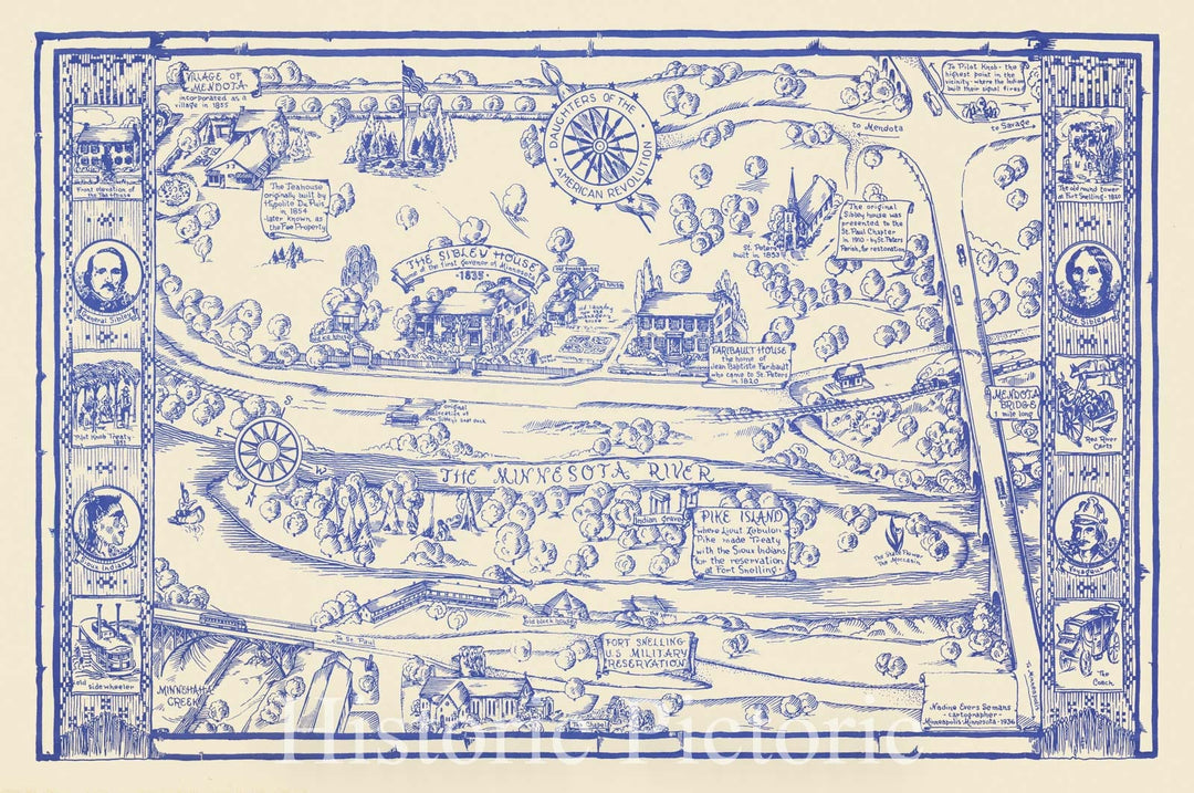 Historic Map : [Pictorial Map of the Minnesota River Valley at Fort Snelling], 1936, Nadine Semans, Vintage Wall Art