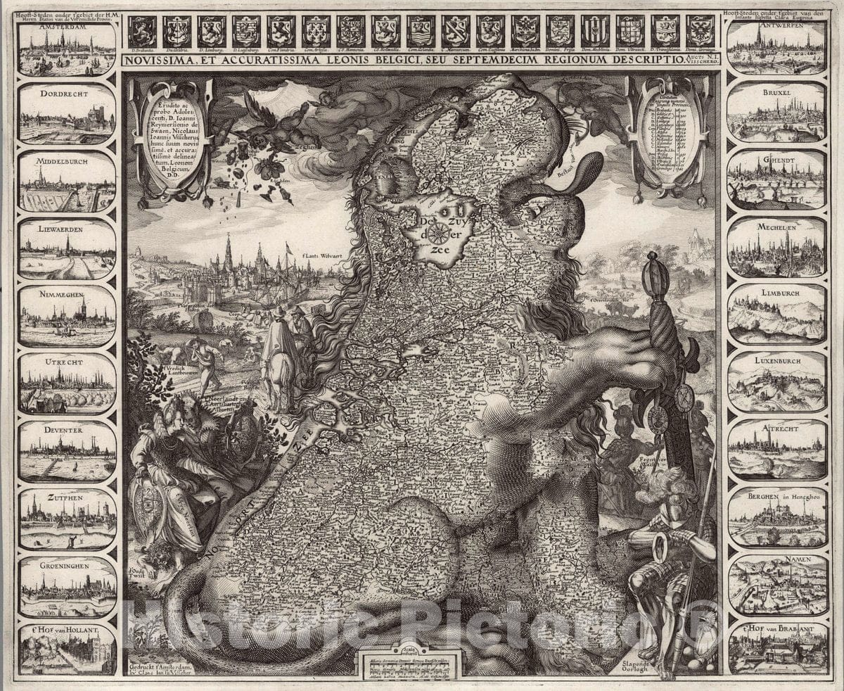 Belgium, Novissima, et Accuratissima Leonis Belgici, Seu Septemdecim Regionum Descriptio, 1611 Pictorial Map , Vintage Wall Art