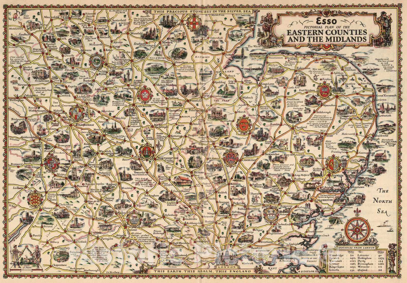 Historic Map : Esso Pictorial Plan of the Eastern Counties and the Midlands. 1932 - Vintage Wall Art