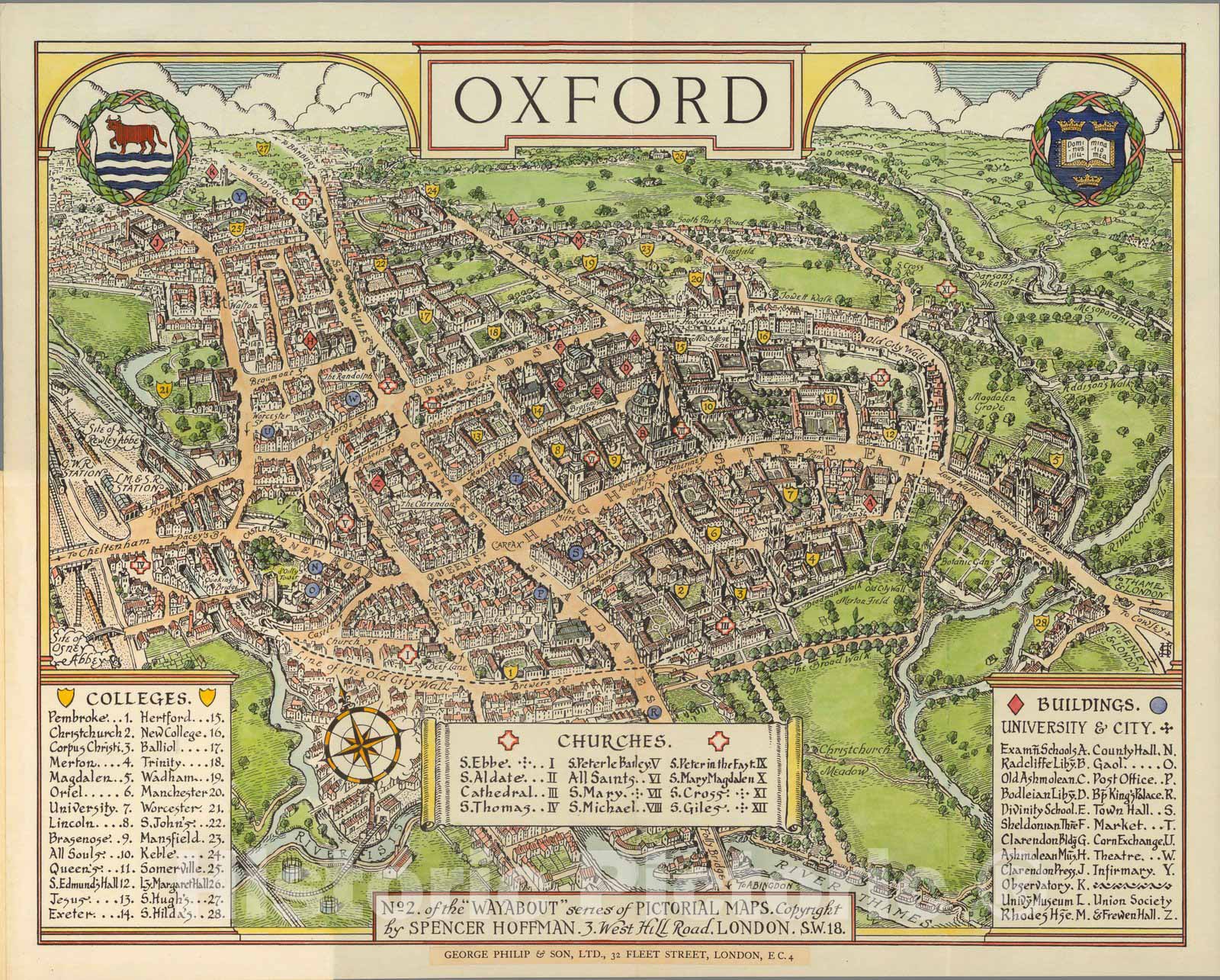 Oxford : No. 2 of the "wayabout" series of pictorial maps. Copyright by Spencer Hoffman ... London. George Philip & Son, Ltd. ... London. (Cover title) No. 2. Philip's "Wayabout" maps. Here is a pictorial map shewing the way about Oxford. Prepared and drawn by G. Spencer Hoffman, M.A. | Oxford : No. 2 of the "wayabout" series of pictorial maps. Copyright by Spencer Hoffman ... London. George Philip & Son, Ltd. ... London. (Cover title) No. 2. Philip's "Wayabout" maps. Here is a pictorial map shewing the way about Oxford. Prepared and drawn by G. Spencer Hoffman, M.A. | See note field above.