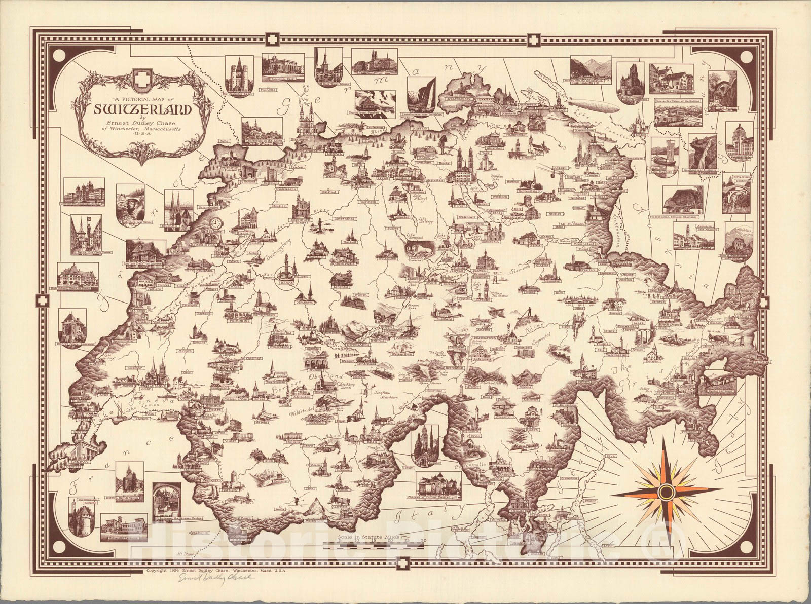 • .Historic Map - A pictorial map of Switzerland, by Ernest Dudley Chase, 1936, - Vintage Wall Art