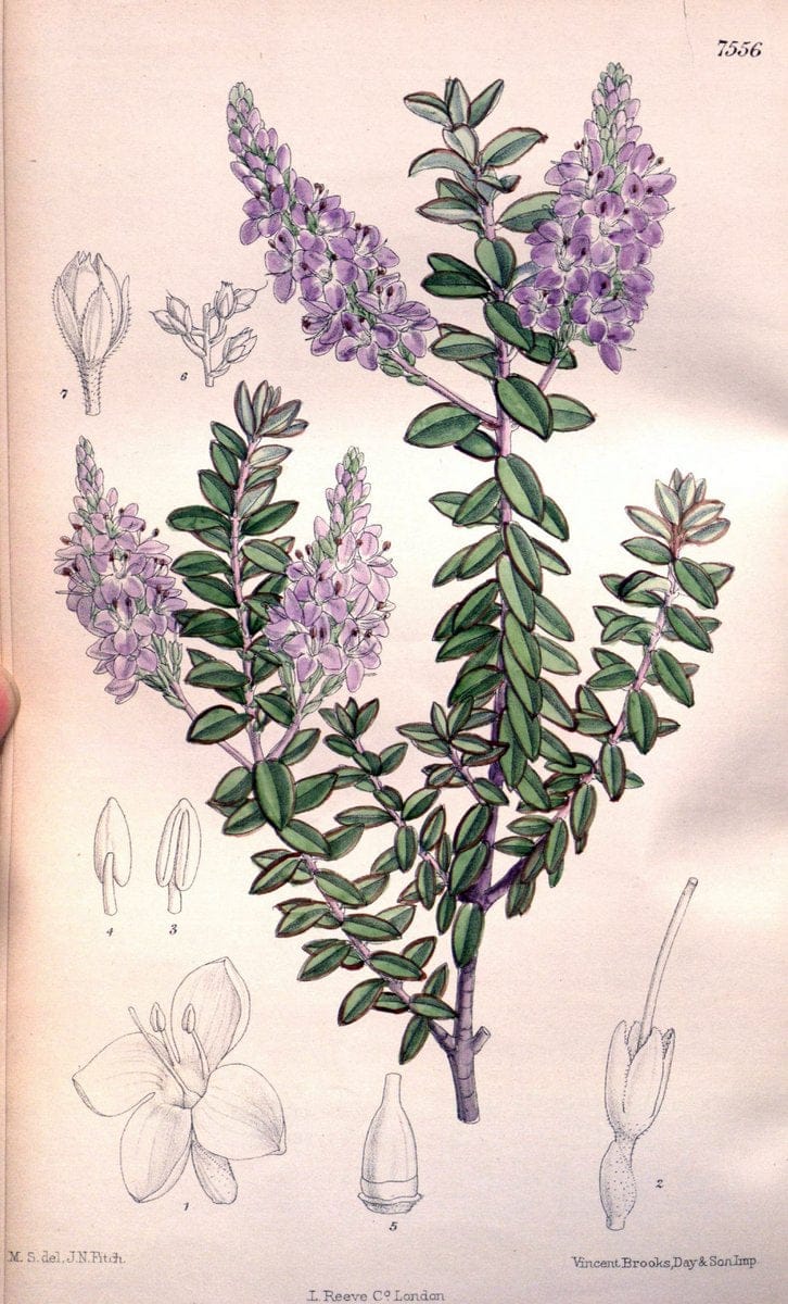 Curtis's botanical magazine. London ; New York [etc.] :Academic Press [etc.].|"Botanical illustration" Botany Periodicals "Pictorial works" "Plants, Ornamental" "Missouri Botanical Garden, Peter H. Raven Library" |artist:name=Matilda Smith | artist:viaf=48272868 | taxonomy:binomial=Veronica balfouriana | geo:country=New Zealand |