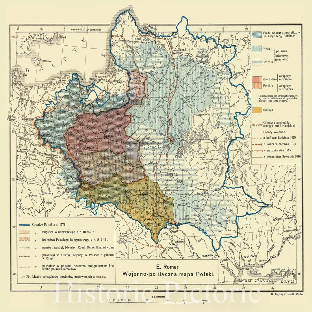 Map : Poland 1916, Wojenno-polityczna mapa Polski : z powodu Manifestu z 5 listopada 1916 , Antique Vintage Reproduction