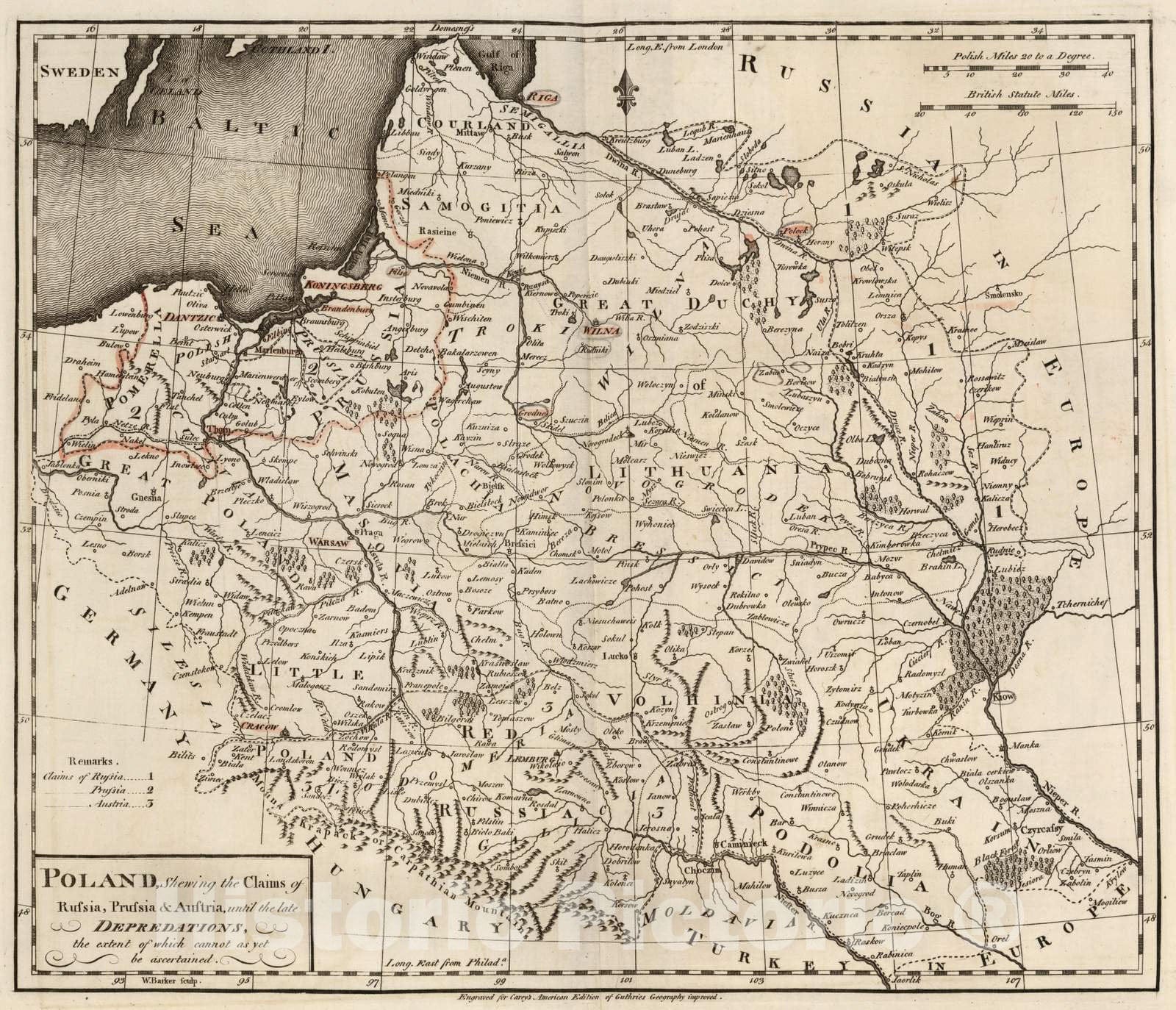 • .Historic Map : 1795 Poland, Shewing The Claims of Russia, Prussia & Austria. - Vintage Wall Art