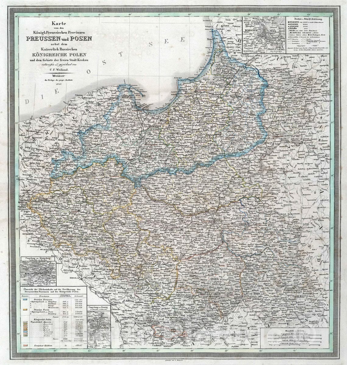 • .Historic Map : 1840 Prussian provinces of Prussia and Posen, with Russian kingdoms of Poland and free city of Krakow. - Vintage Wall Art