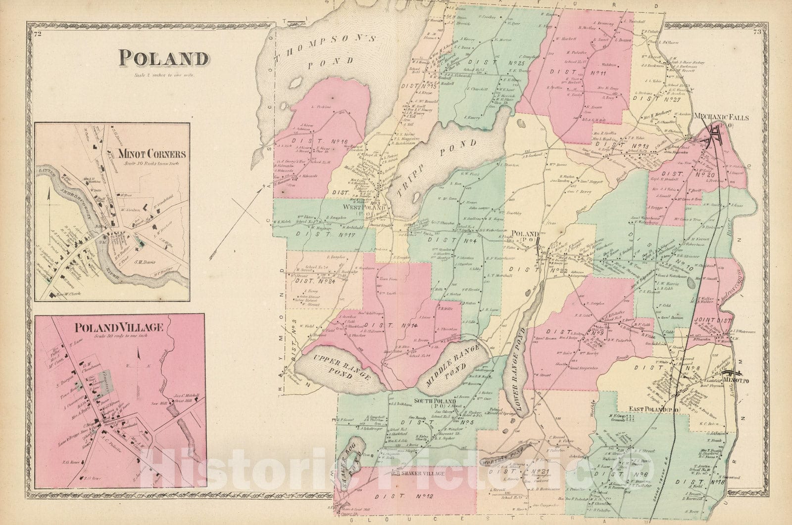 Historic Map : 1873 Poland, Androscoggin County, Maine. Poland Village. Minot Corners. - Vintage Wall Art