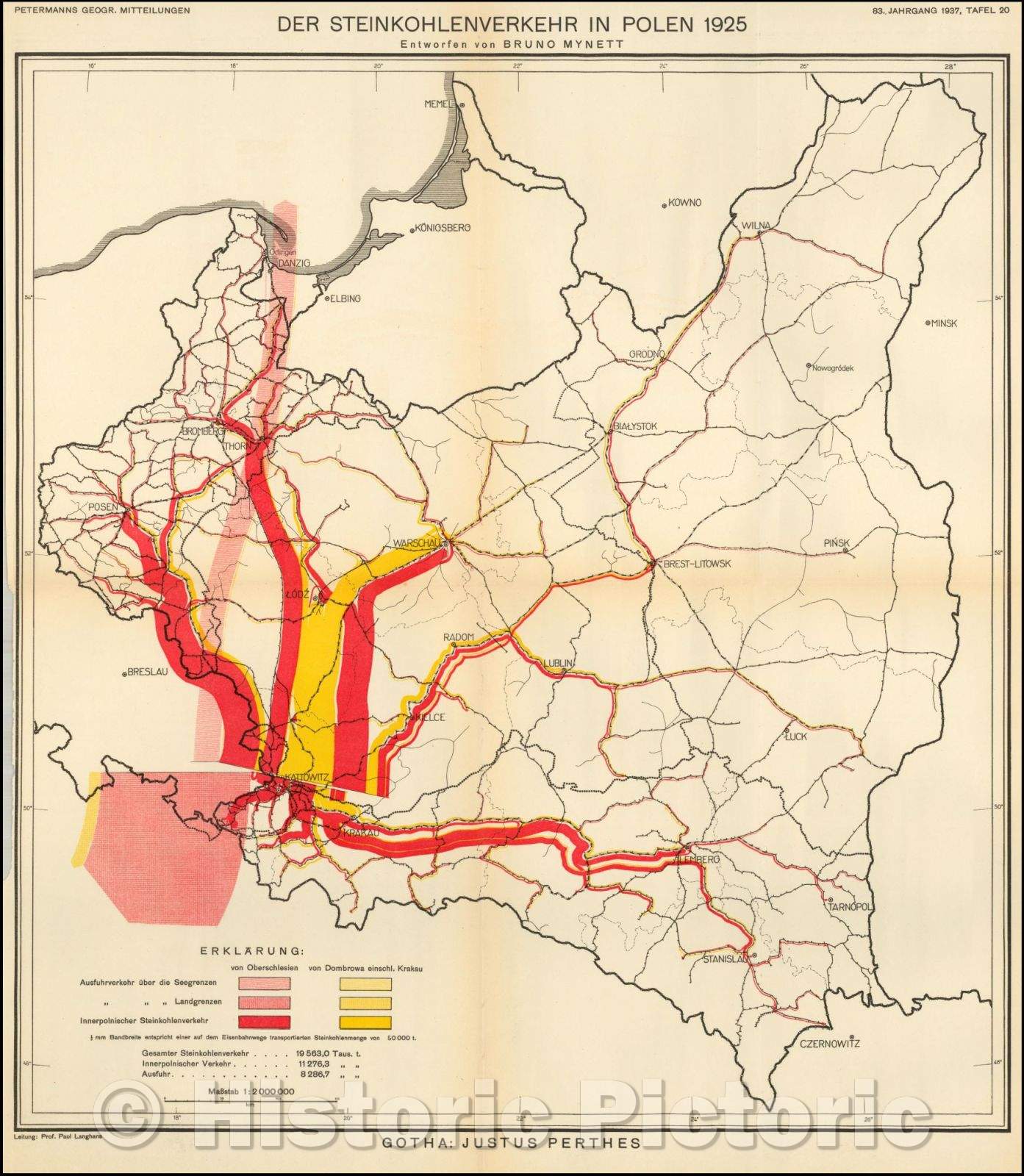 Der Steinkohlenverkehr in Polen 1925 Entworfen von Bruno Mynett / Thematic Map of Poland, showing the Coal Industry in 1925, 1937
