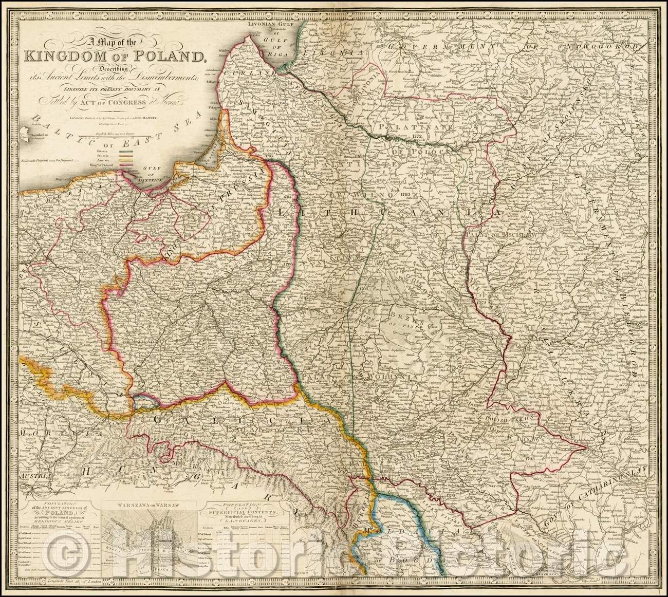 • .Historic Map - A Map of the Kingdom of Poland, Describing its Ancient Limits with the Dismemberments, 1815, James Wyld - Vintage Wall Art