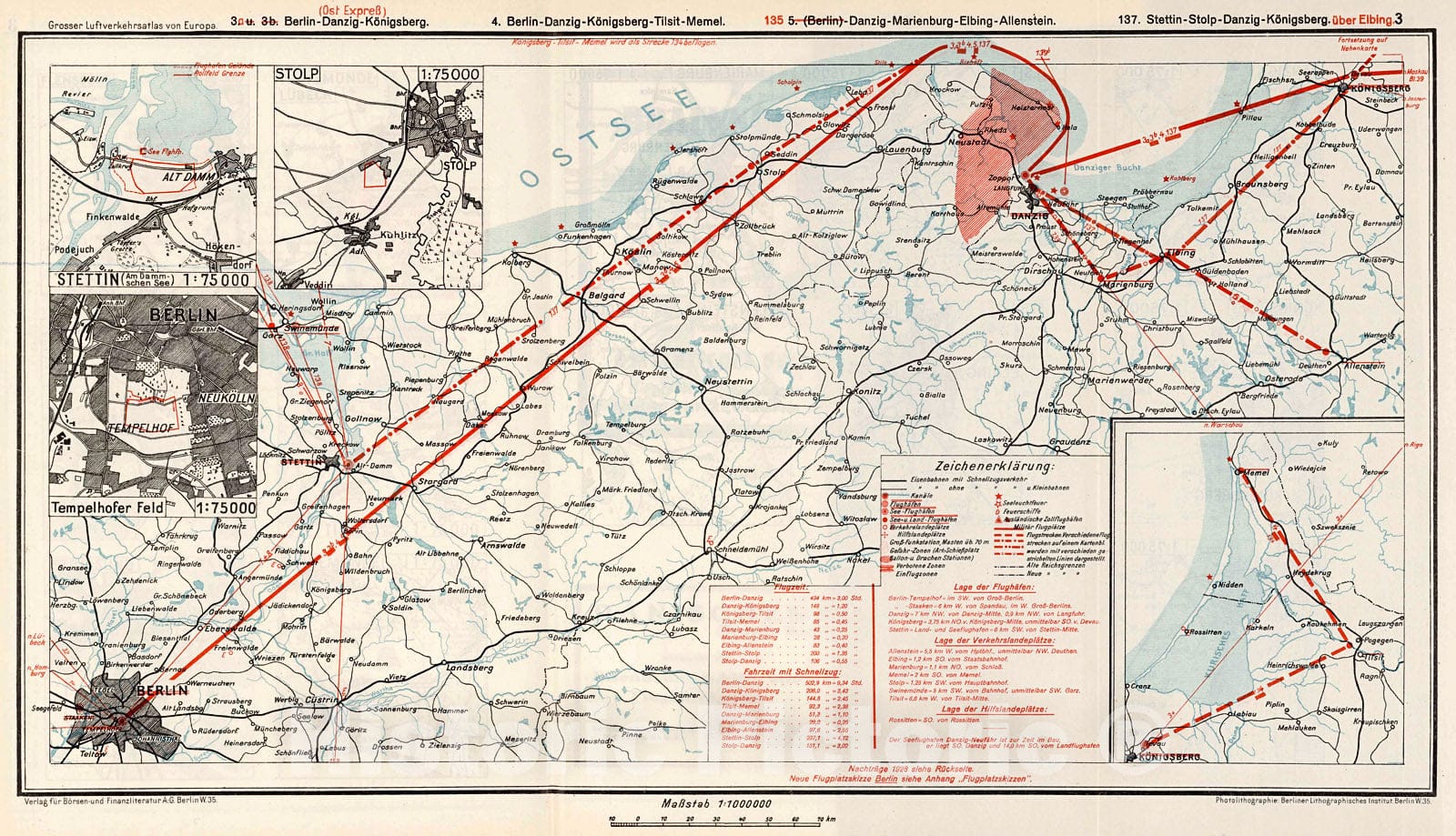Northern Germany and Poland Airline Route Maps. (insets) (Airport Locations)., 1928, Vintage Wall Decor