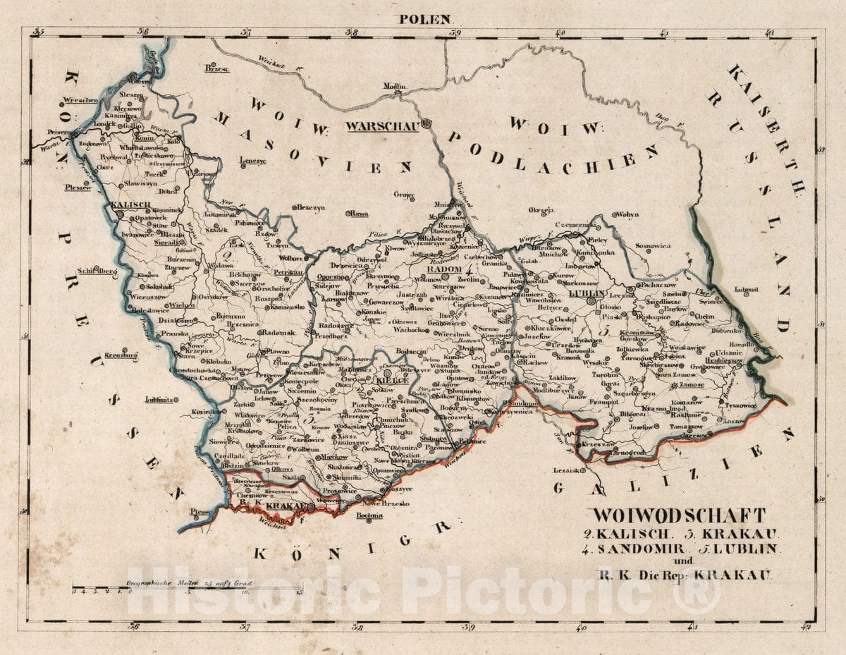 Polen. Woiwodschaft: 2. Kalische. 3. Krakau. 4. Sandomir. 5. Lublin, und R.K. die Rep: Krakau. (to accompany) Atlas von Europa nebst den Kolonien : Vierzehnte Lieferung. Leipzig bei Georg Joachim Goschen 1829. | Atlas von Europa nebst den Kolonien : fur Geschaftsmanner, Zeitungsleser und Besitzer des Conversations-Lexicons in einer Folge von Charten und einem alphabetisch eingerichteten Texte : bearbeitet von W. E. A. v. Schlieben ... Leipzig bei Georg Joachim Goschen 1825. O. Hermann, Lith. | Publisher:Georg Joachim Goschen