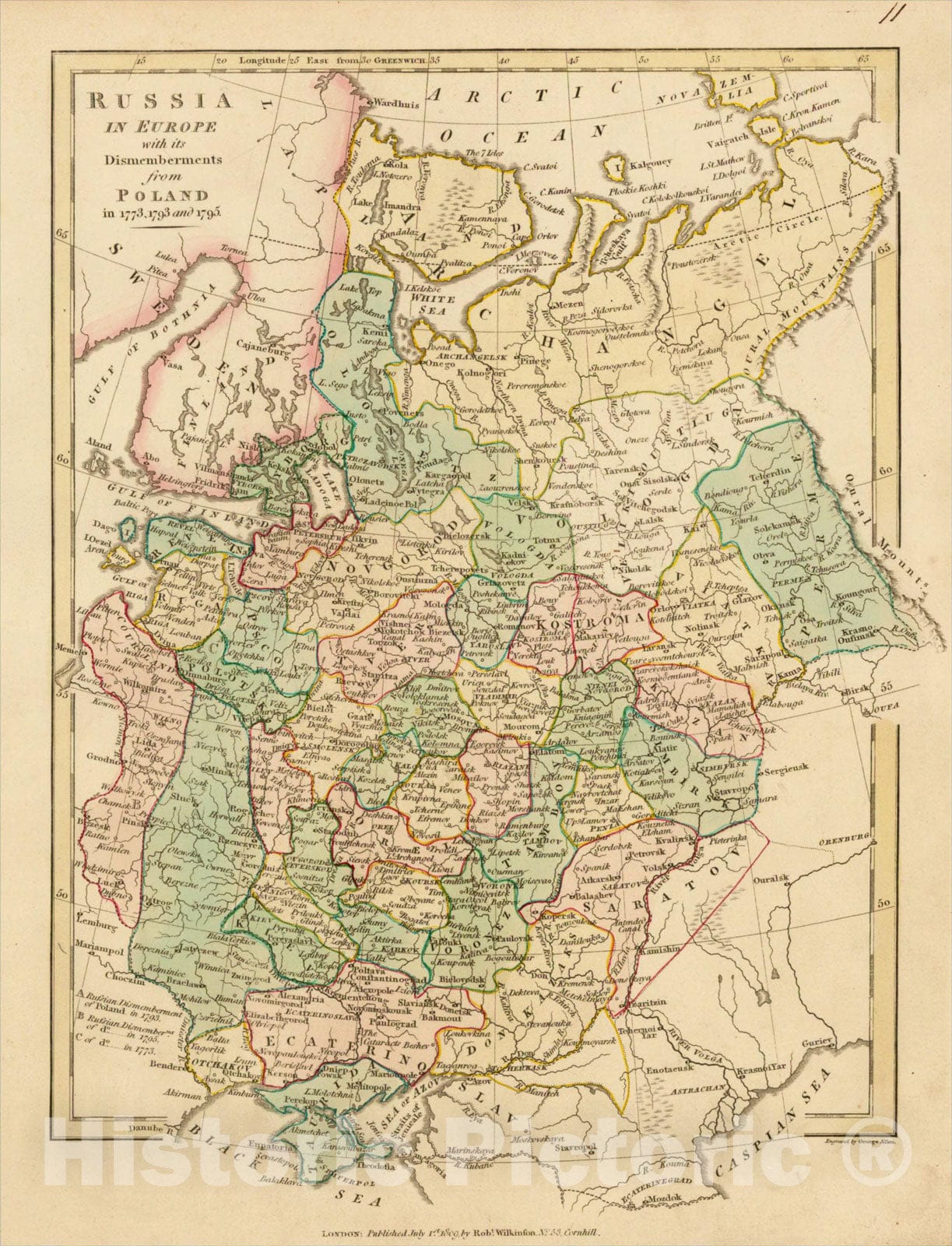 Historic Map : Russia In Europe with its Dismemberments from Poland in 1773, 1793 and 1795, 1809, Robert Wilkinson, Vintage Wall Art