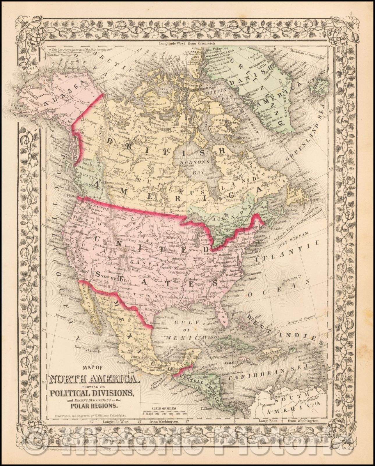 Historic Map - Map of North America Showing Its Political Divisions, and Recent Discoveries in the Polar Regions, 1865, Samuel Augustus Mitchell Jr. v3