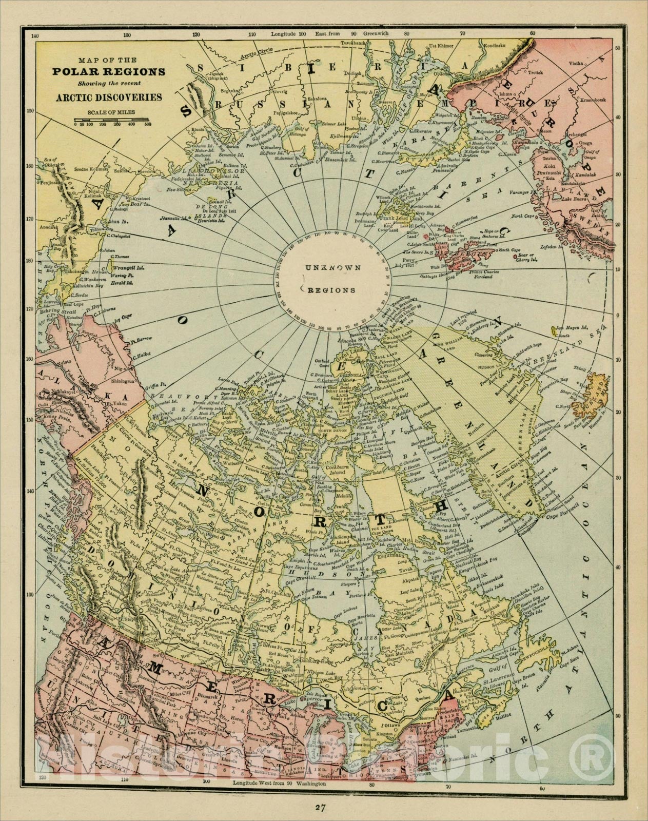 Historic Map : Map of the Polar Regions Showing the recent Arctic Discoveries, 1892, George F. Cram, Vintage Wall Art