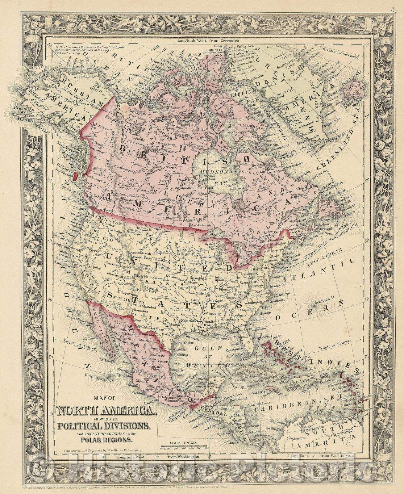 Historic Map : Map of North America Showing its Political Divisions and Recent Discoveries in the Polar regions constructed and engraved by W. Williams, 1860 , Vintage Wall Art