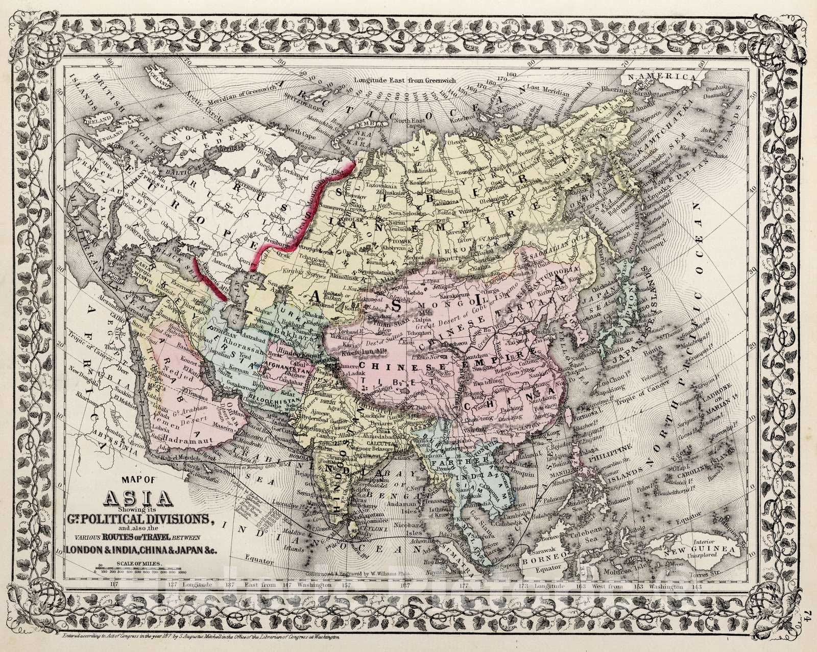 • Historic Map : 1874 Map of Asia showing its gt. political divisions - Vintage Wall Art