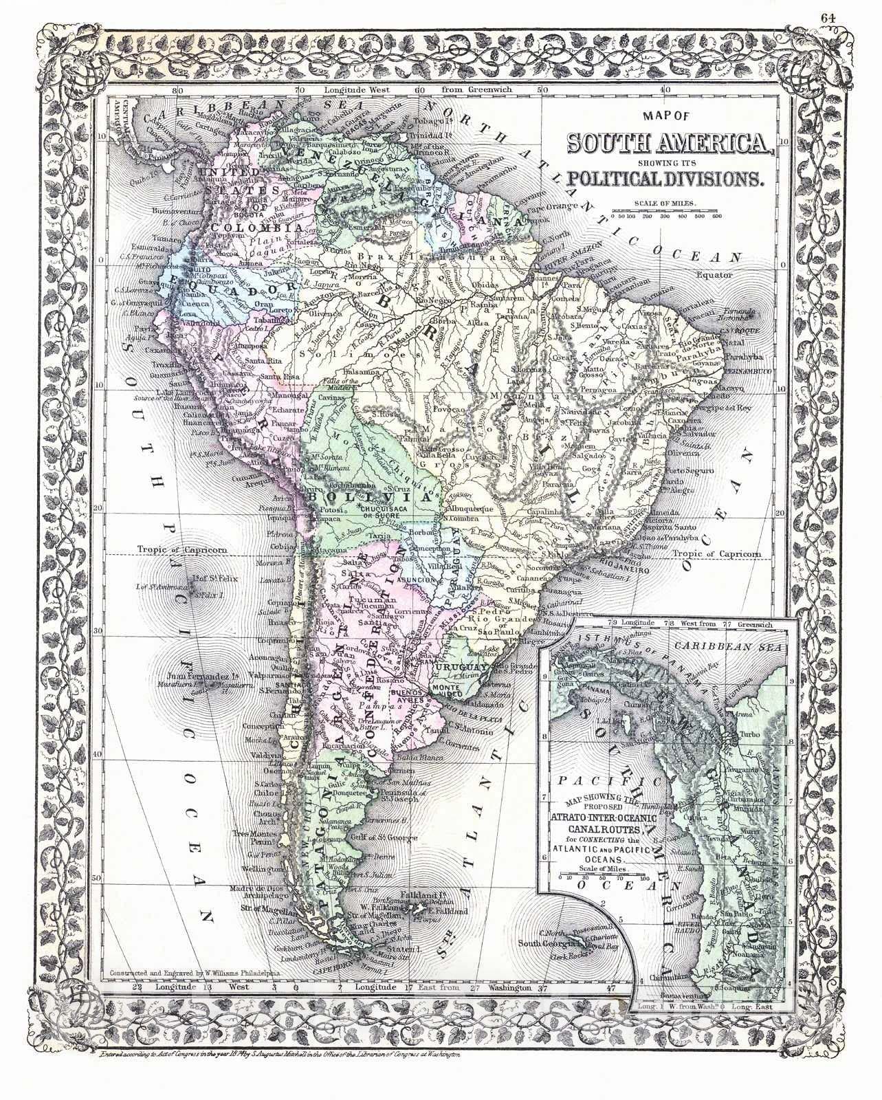 Historic Map : 1874 Map of South America Showing Its Political Divisons : Vintage Wall Art