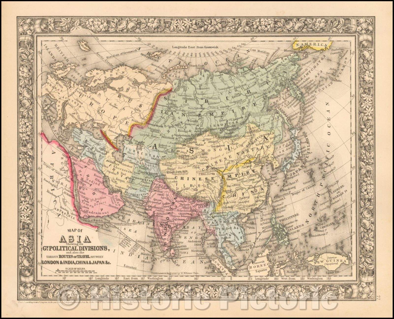• .Historic Map - Map of Asia Showing its Gt. Political Divisions and.Routes of Trade between London & India, China, Japan, 1864, Samuel Augustus Mitchell Jr. - Vintage Wall Art