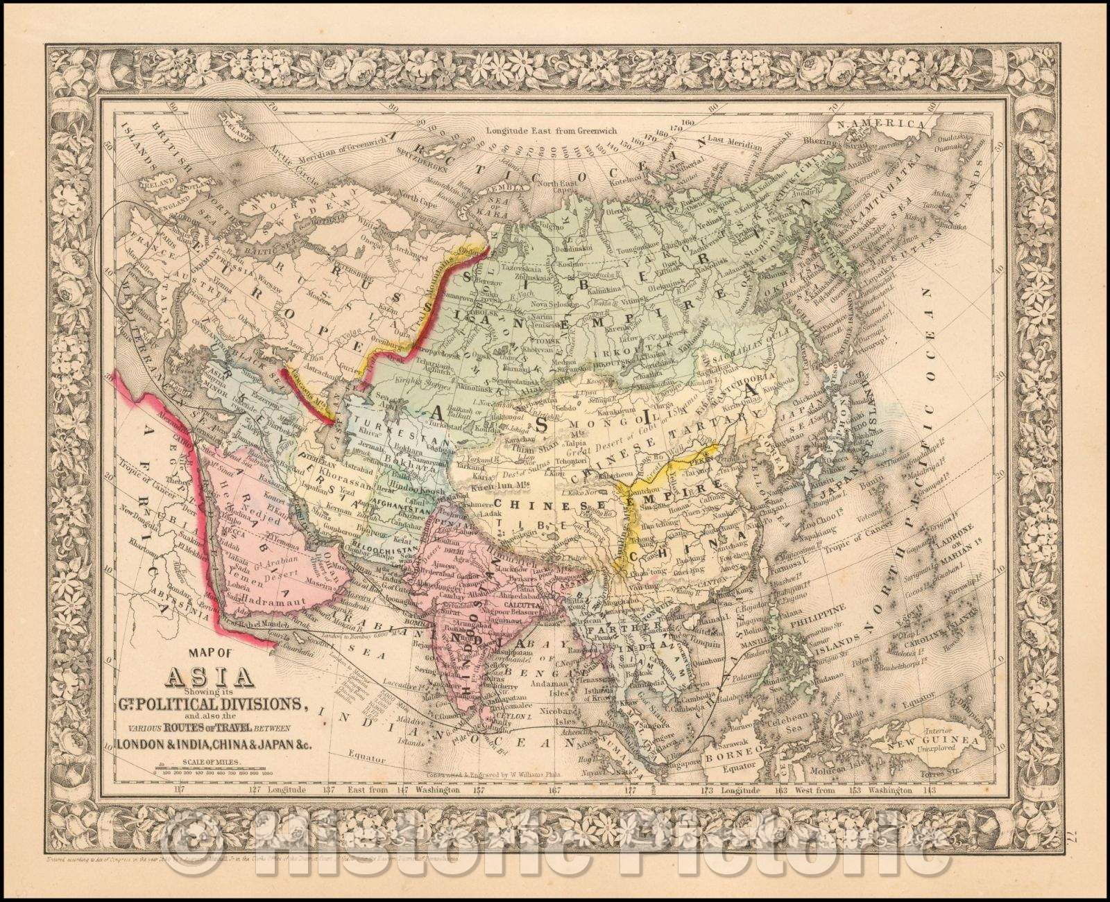 Historic Map - Map of Asia Showing its Gt. Political Divisions and.Routes of Trade between London & India, China, Japan, 1865, Samuel Augustus Mitchell Jr. v2