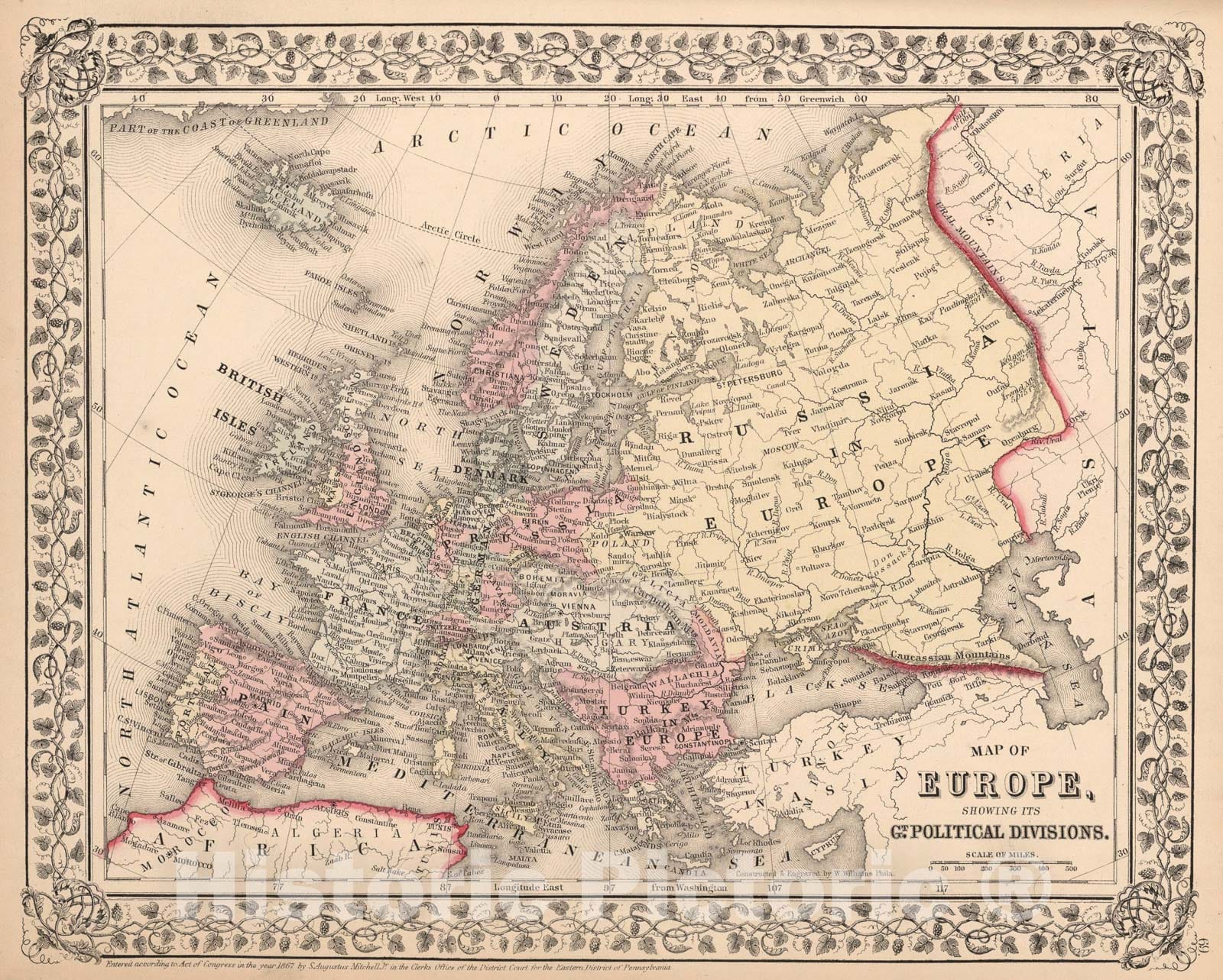 • .Historic Map : Map of Europe, Showing its Gt. Political Divisions, 1868, Vintage Wall Art