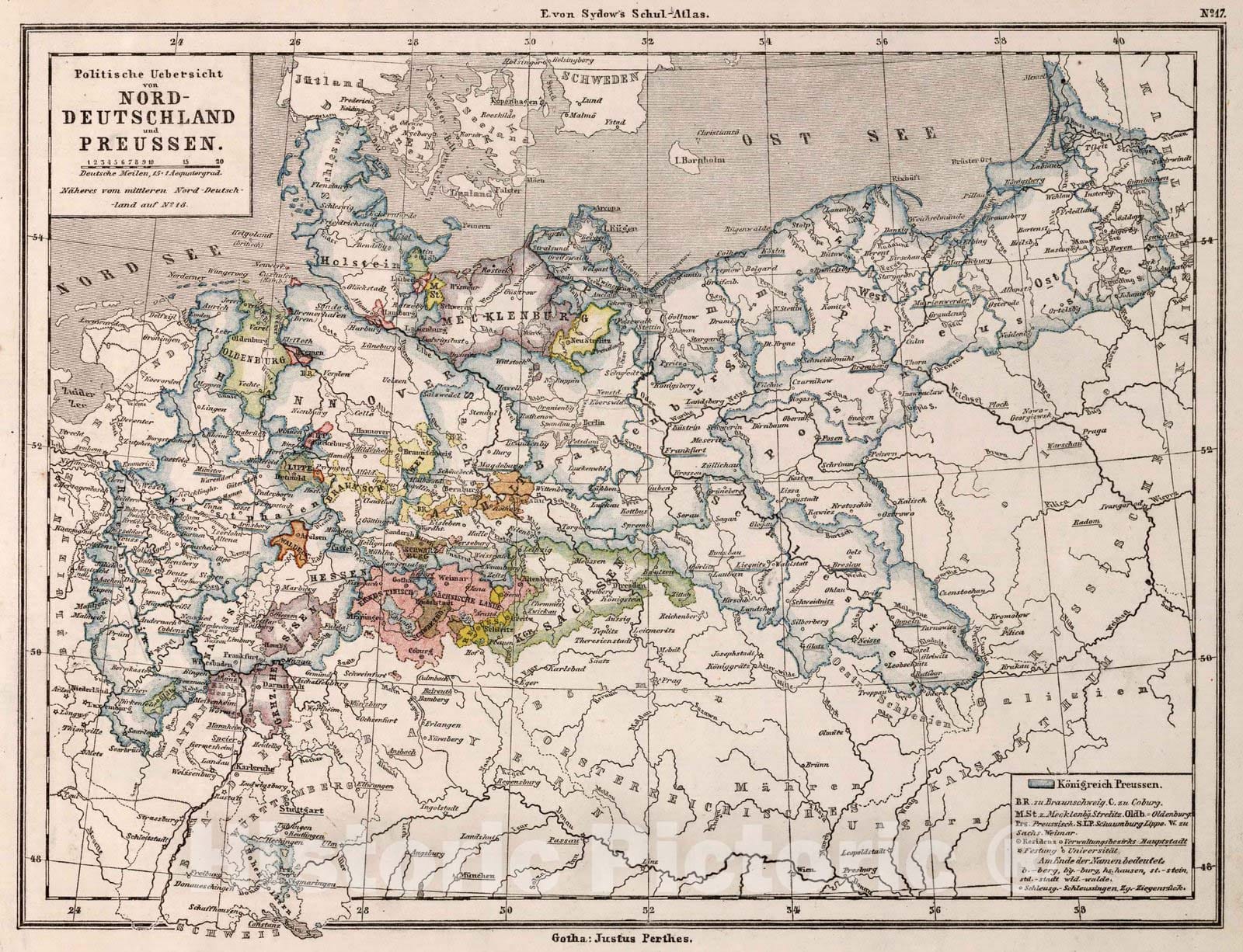 17. Politische Uebersicht von Nord-Deutschland und Preussen. (Political Overview of Northern Germany and Prussia.) | E. von Sydow's Schul-Atlas in Zwei und Vierzig Karten. Gotha: Justus Perthus. 1872. | In German.