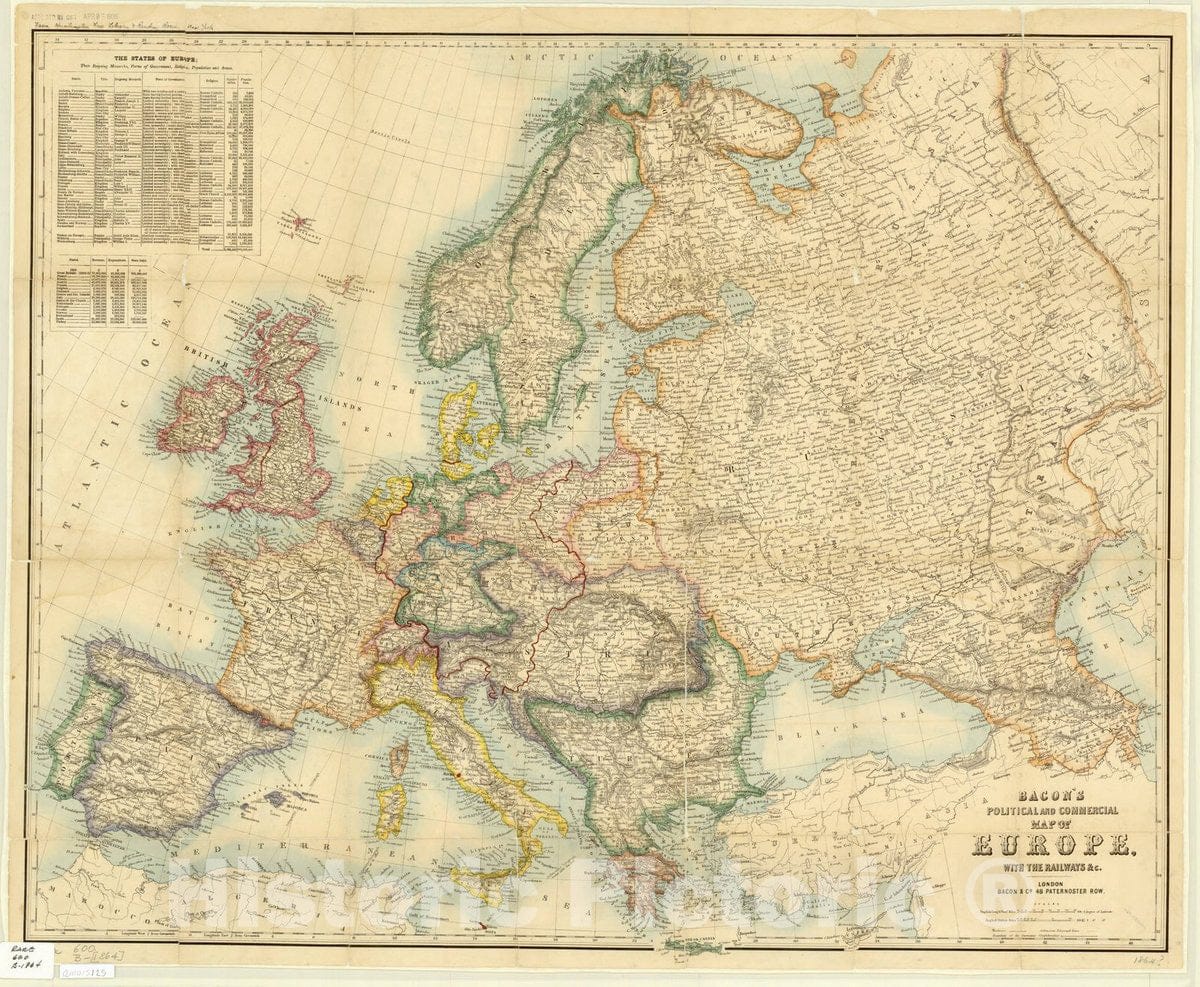 Map : Europe 1864, Bacon's political and commercial map of Europe with the railways &c, Antique Vintage Reproduction