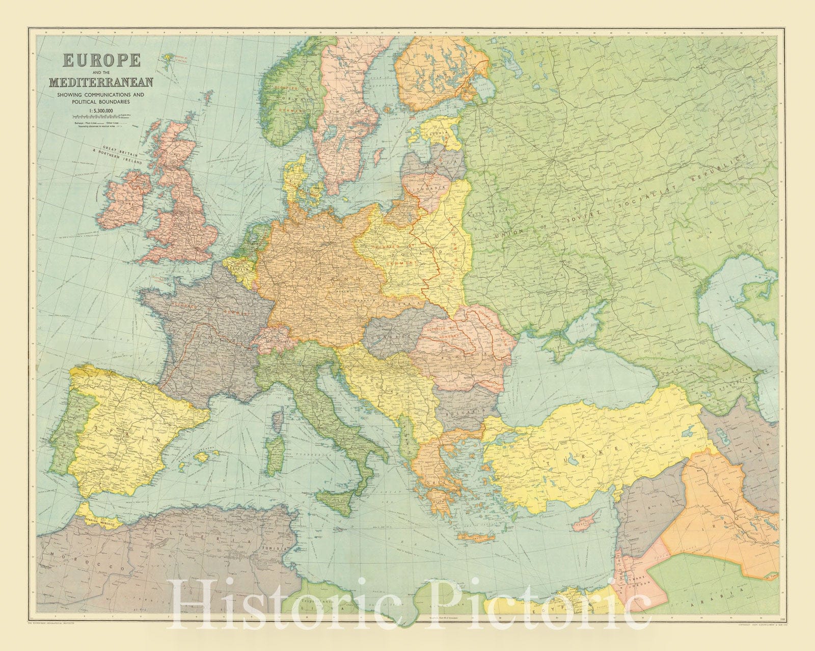 Map : Europe 1939 2, Bartholomew's map of Europe & the Mediterranean showing communications and political boundaries , Antique Vintage Reproduction