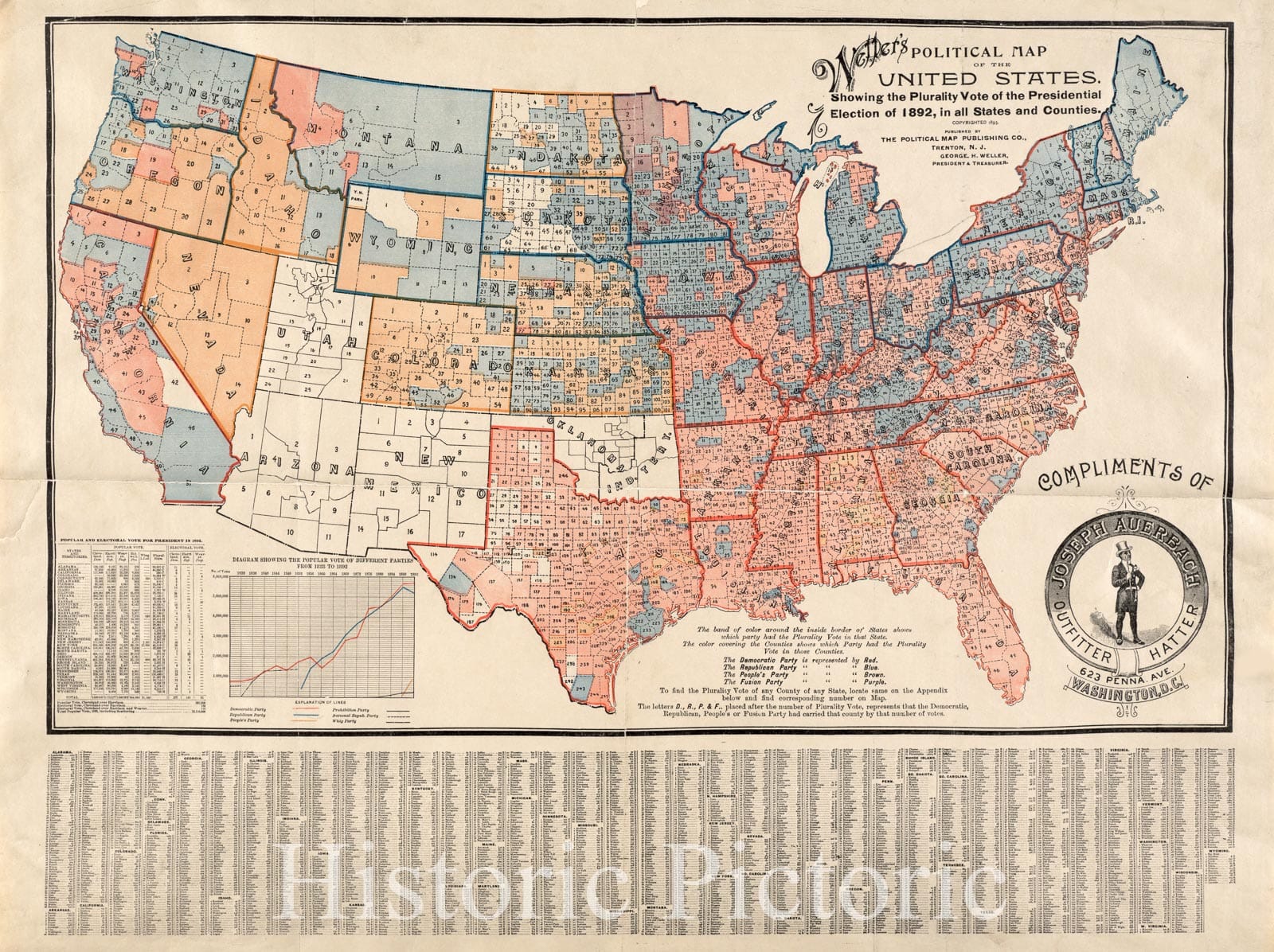 Historical Map, Weller's Political map of The United States : Showing The Plurality Vote of The Presidential Election of 1892, in All States and Counties, Vintage Wall Art