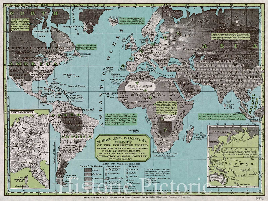 Historic Map : Moral and Political Chart of the Inhabited World exhibiting the Prevailing Religion, Form of Government, Degree of Civilization and Population, 1821 , Vintage Wall Art