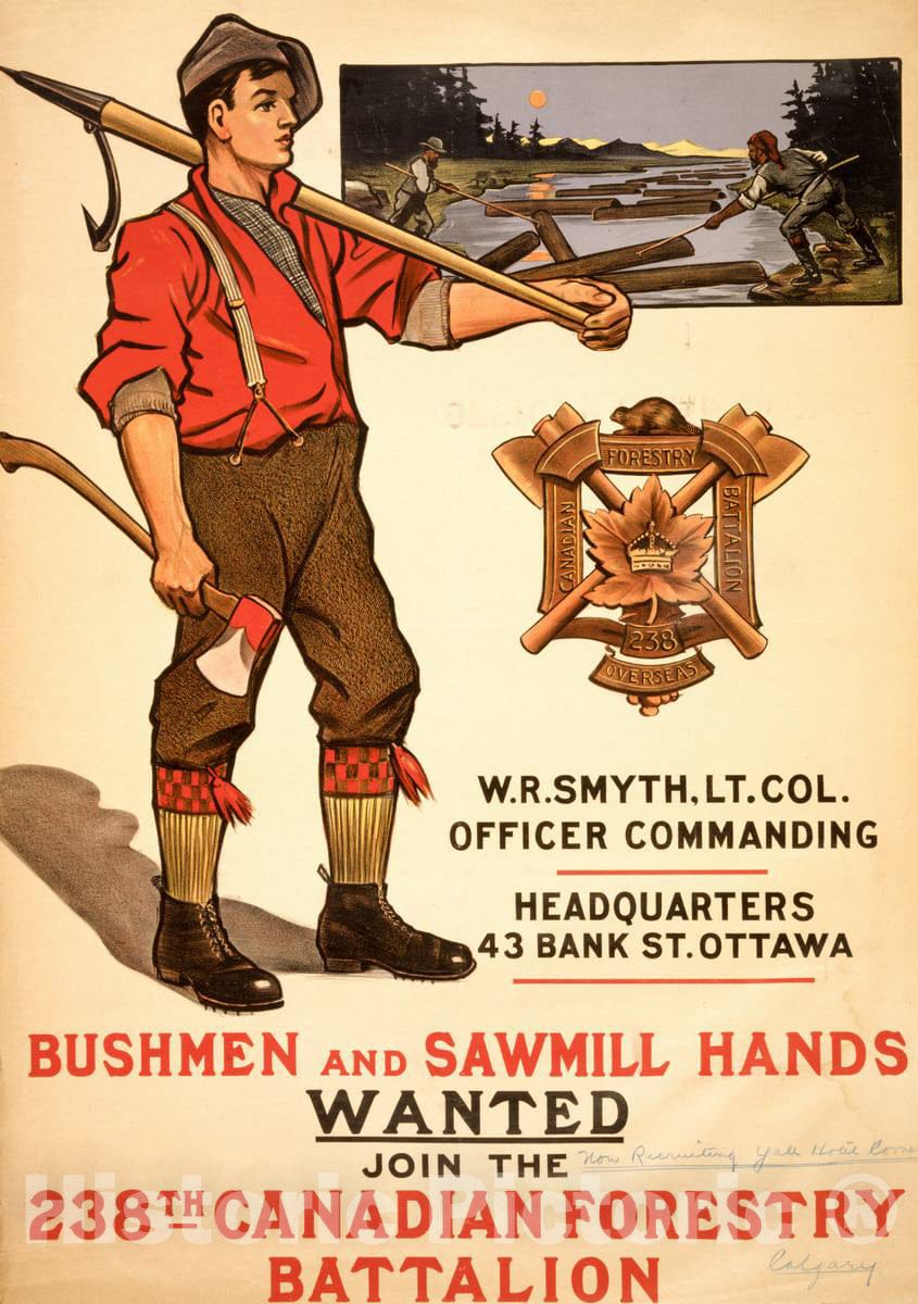 • .Vintage Poster -  Bushmen and Sawmill Hands Wanted. Join The 238th Canadian Forestry Battalion, Historic Wall Art