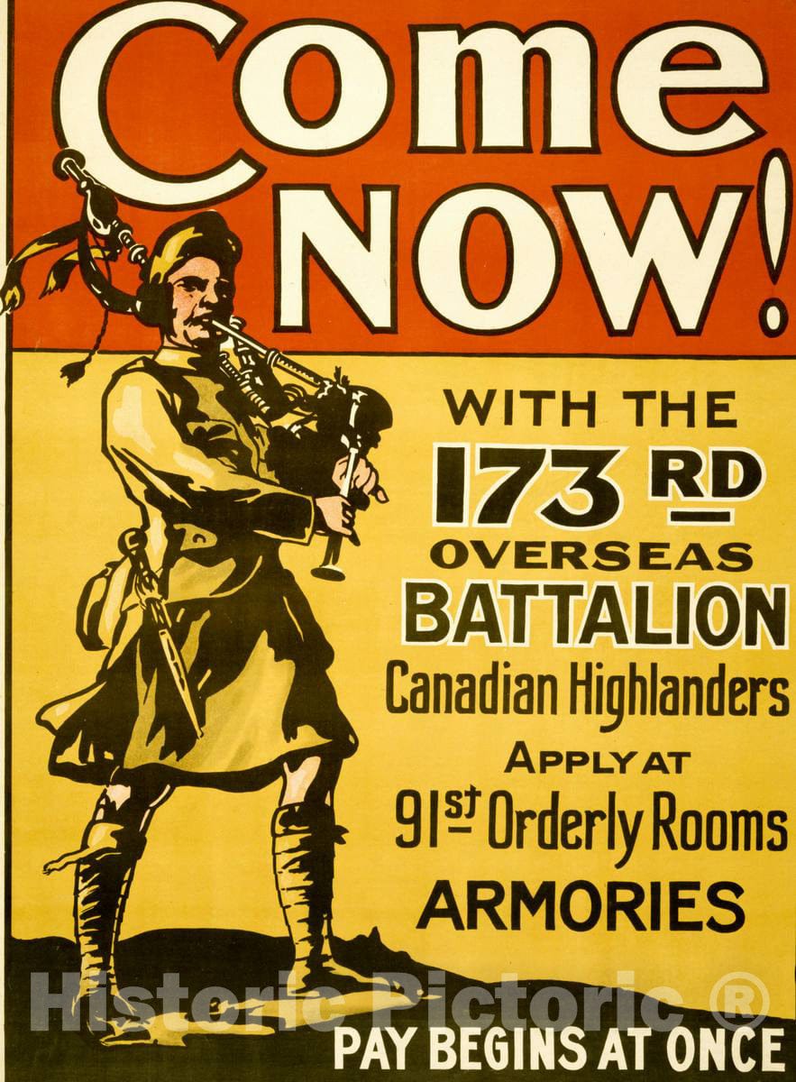 Vintage Poster - Come Now! with The 173rd Overseas Battalion, Canadian Highlanders, Historic Wall Art