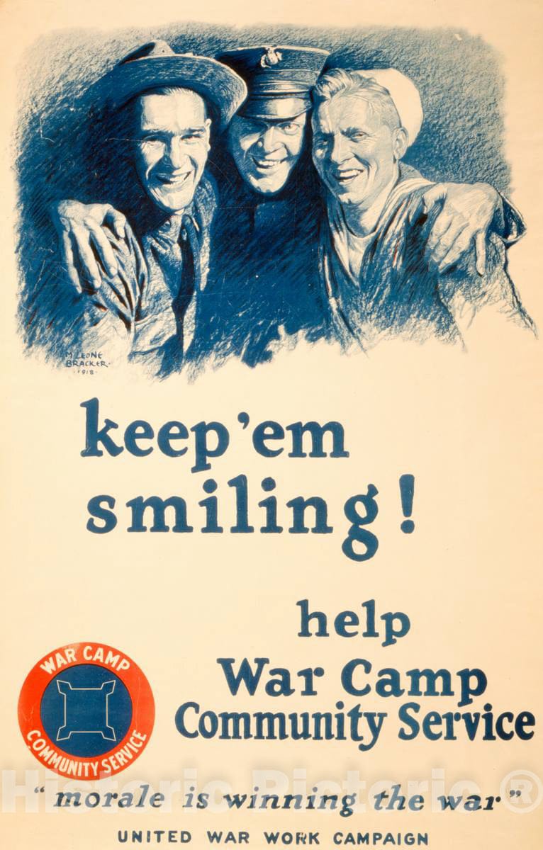 Vintage Poster - Keep 'em Smiling! Help War Camp Community Service Morale is Winning The war - United War Work Campaign - M. Leone Bracker 1918., Historic Wall Art