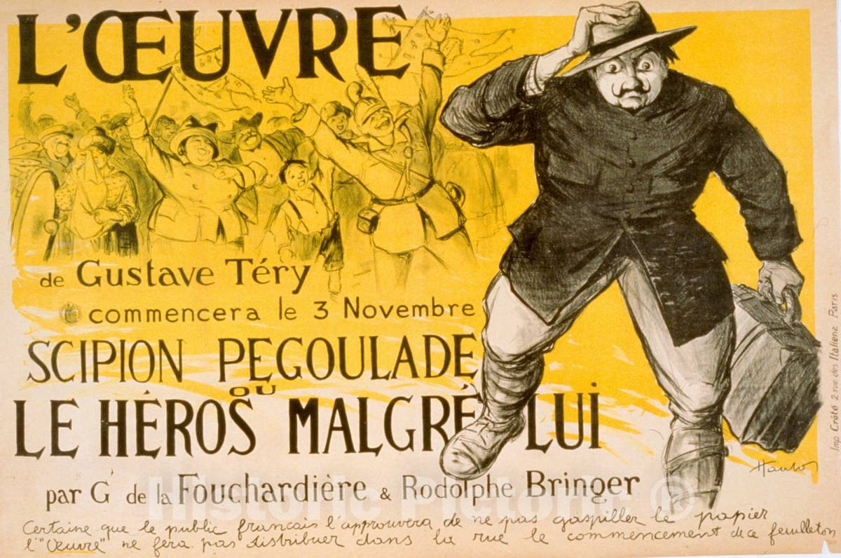 Vintage Poster - L'Oeuvre' de Gustave Téry commencera le 3 novembre.Scipion Pegoulade ou Le Héros malgré lui par G. de la Fouchardière et Rodolphe Bringer, Historic Wall Art