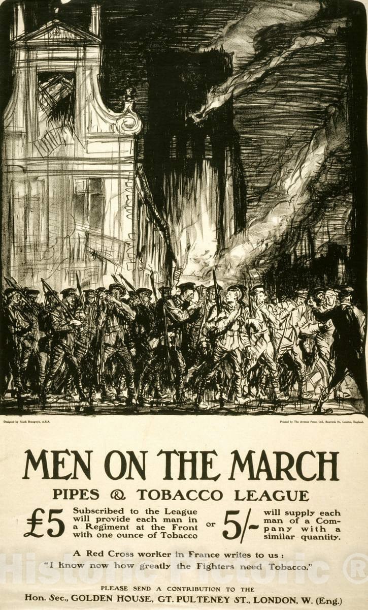 Men on the March Pipes & Tobacco League | designed by Frank Brangwyn, A.R.A. ; printed by The Avenue Press, Ltd., Bouverie St., London, England.