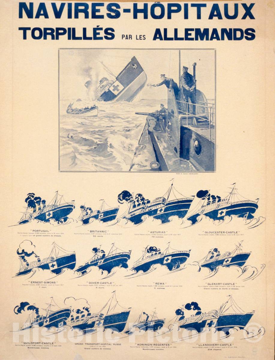 Vintage Poster - Navires - H'pitaux torpillés par les allemands, Historic Wall Art