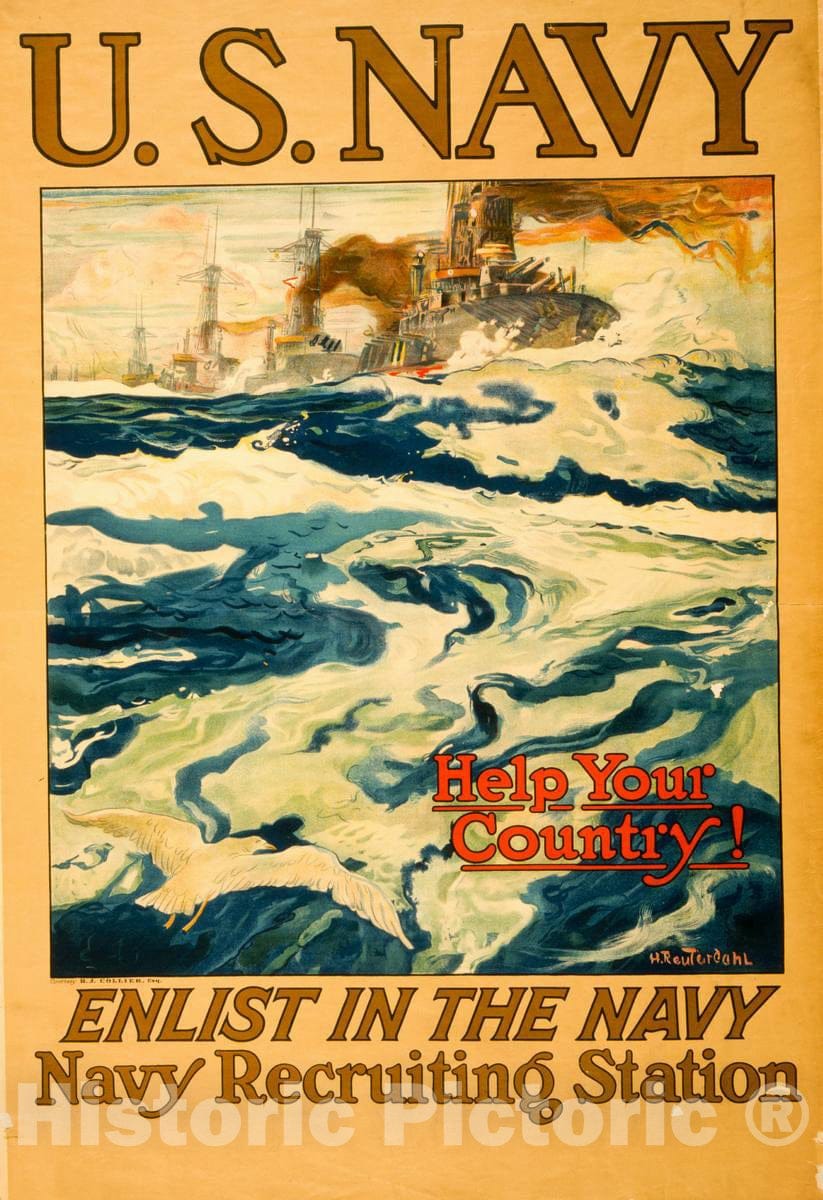Vintage Poster - U.S. Navy - Help Your Country! Enlist in The Navy - H. Reuterdahl., Historic Wall Art
