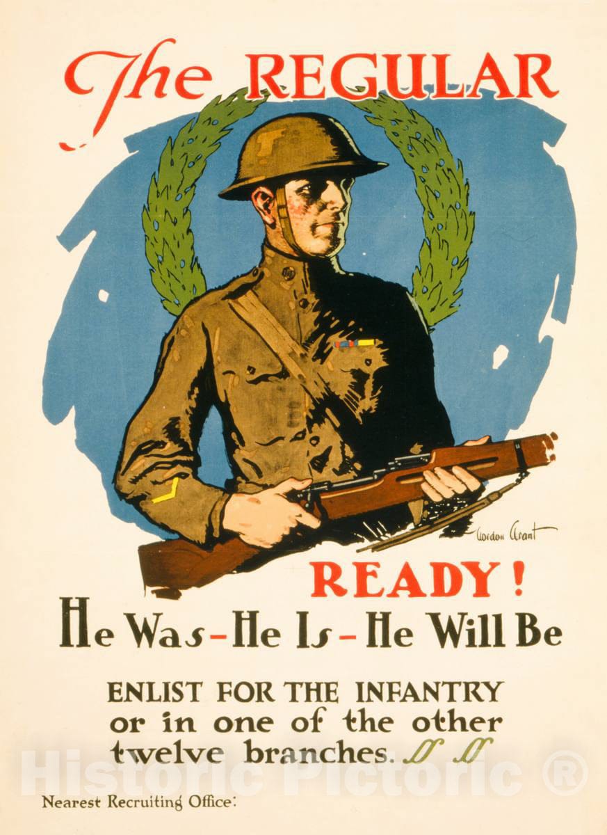 • .Vintage Poster -  The Regular -  Ready! He was -  he is -  he Will be Enlist for The Infantry or in one of The Other Twelve Branches  -  Gordon Grant., Historic Wall Art