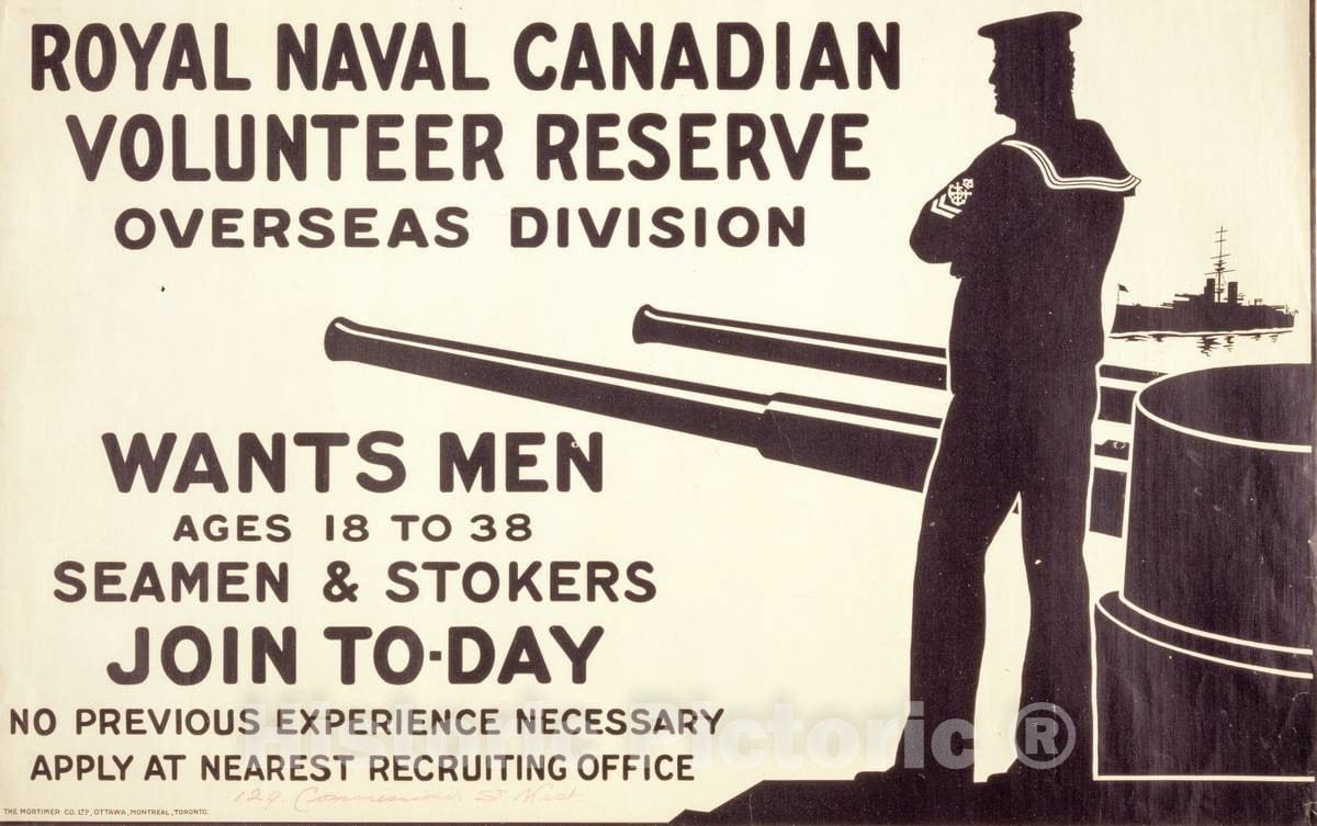 Vintage Poster - Royal Naval Canadian Volunteer Reserve Overseas Division Wants Men Ages 18 to 38. Seamen & Stokers. Join to - Day, Historic Wall Art