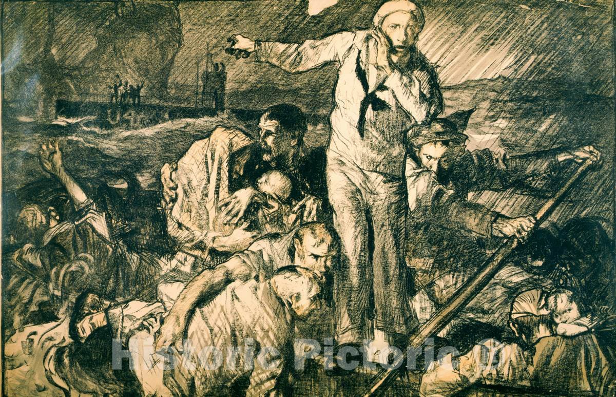 Vintage Poster - [Sailors and Others in a Lifeboat, as one Sailor Gestures to a Submarine in The Background] - F. Brangwyn A.R.A., Historic Wall Art