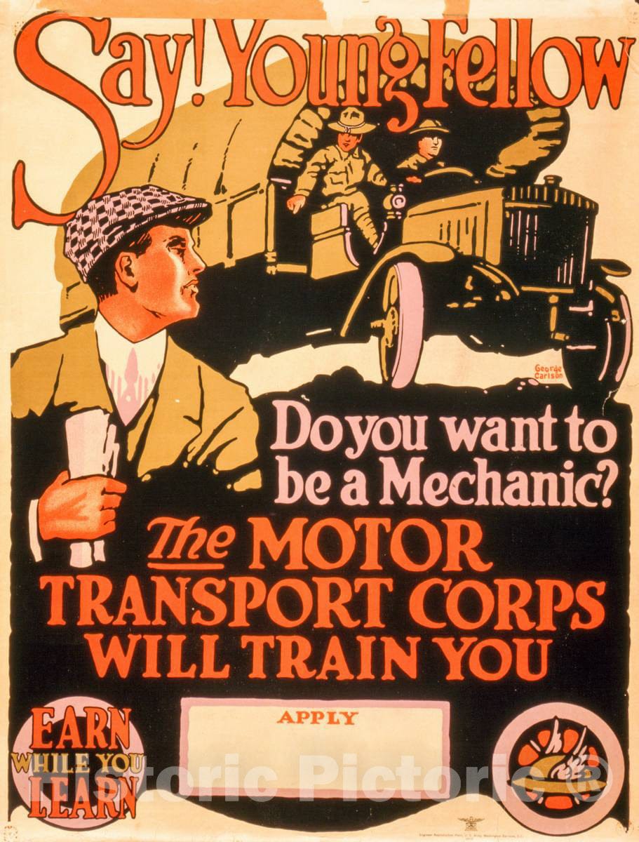 Vintage Poster - Say! Young Fellow, do You Want to be a Mechanic? The Motor Transport Corps Will Train You. Earn While You Learn - George Carlson., Historic Wall Art