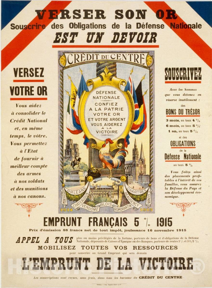 Vintage Poster - Versez Son or. Souscrire des obligations de la défense Nationale. C'est un Devoir. L'Emprunt de la Victoire, Historic Wall Art