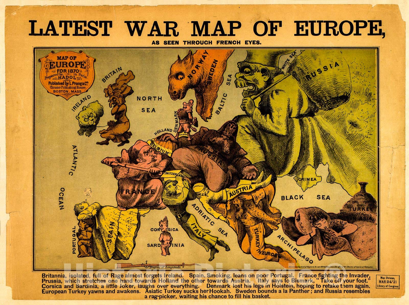 Historic 1870 Map - Latest war map of Europe : as seen Through French Eyes