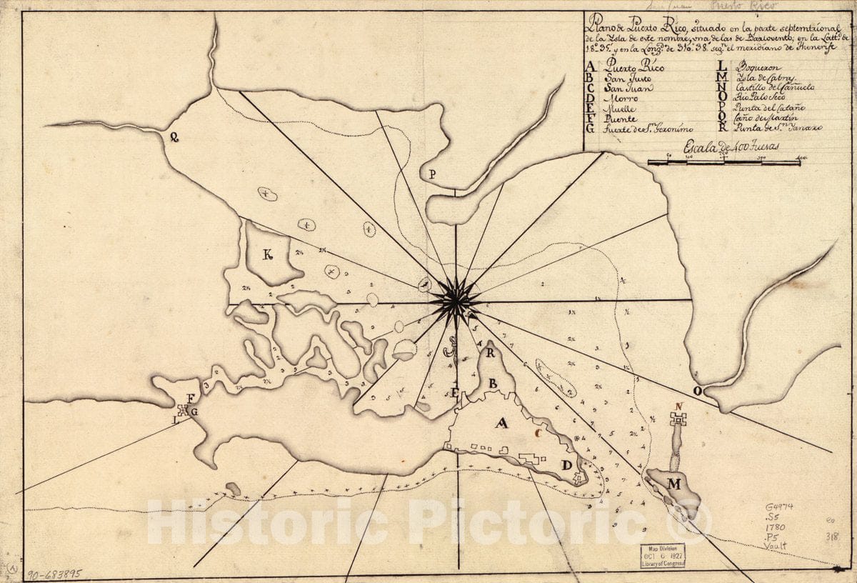 Historic 1780 Map - Plano de Puerto Rico, situado en la Parte septemtrional de la ysla de este nombre, UNA de las de Barlovento en la lattd. DE 1835 y en la longd. de 31038 segn.